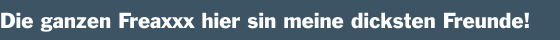 Hier ma n paar Friends of mine aufgelistet : - L33TER -Nuc.1ear (oder wie auch immer er sich schreiben mag...^^) -Enzo -Pr33star -Kalle -Anni -DJ Schmiddi -de Schleuse -$charlie -Wildthing (der ich schon mal beim genagelt werden zugeschaut habe, nein, nich was ihr denkt!! Im Nagelstudio!) -Tiescharh -Hubi -Lydia -de Lydi ohne Schuhe aka Toasttante -Jay (greetz nach AB zum Lö-Nachbar) -Blade -Dago